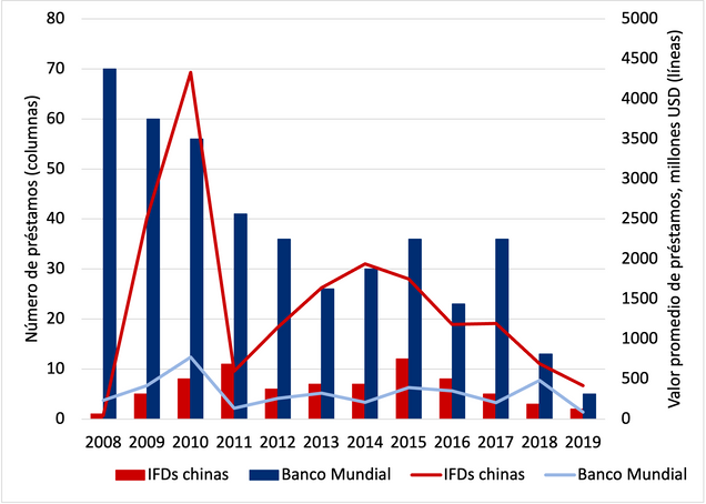 Entre 2008 y 2019, los países de América Latina suscribieron $132 mil millones de créditos de las instituciones chinas para el financiamiento de desarrollo (IFDs) y $155 mil millones del Banco Mundial, incluso las ventanillas del Banco Internacional para la Reconstrucción de Desarrollo y de la Asociación Internacional para el Desarrollo.