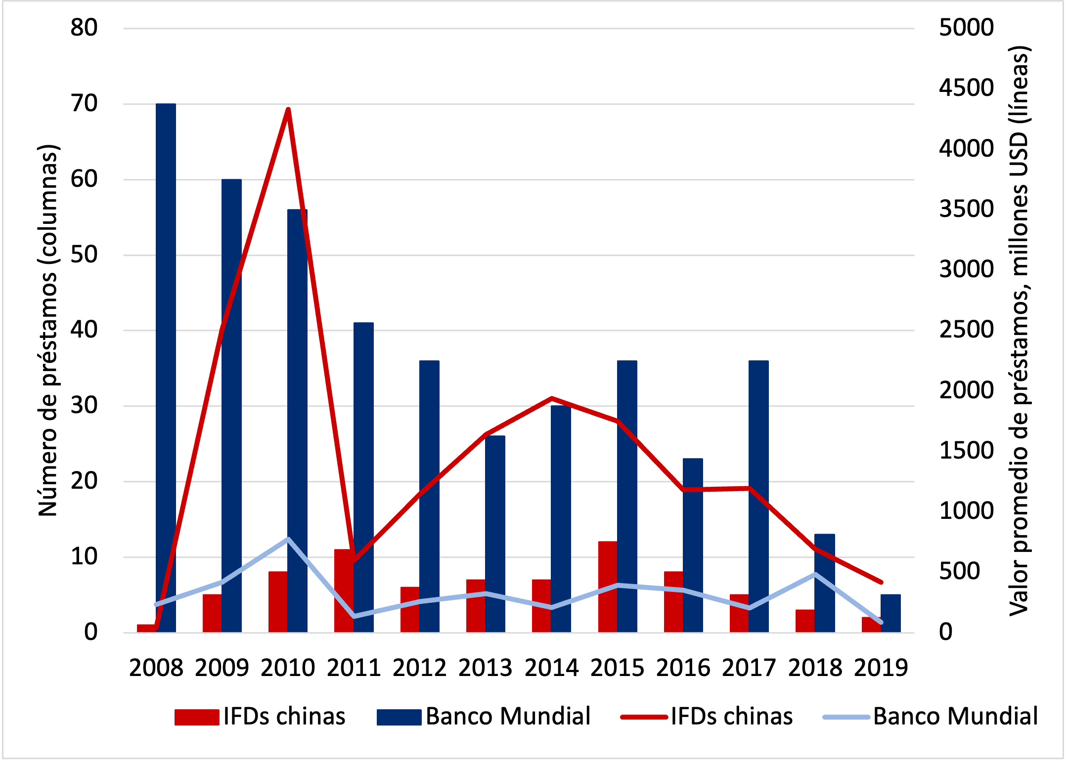 La primera figura demuestra las tendencias en los préstamos a países latinoamericanos. En general, los países de la región han suscrito un mayor número de créditos con el Banco Mundial. Aun así, los montos promedios de las principales IFDs chinas, el Banco Chino del Desarrollo (CDB) y el Banco de Exportaciones e Importaciones de China (CHEXIM), han sido mayores.
