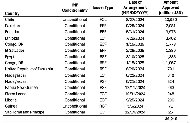 During the tracked period between May 2024 and March 2025, the IMF approved over $36 billion in new lending, as detailed in Table 1. The majority of this funding—more than $22 billion—was allocated through conditional lending arrangements that require recipient countries to implement agreed-upon policy reforms. In addition, two countries accessed the IMF’s unconditional financing windows: Chile renewed its precautionary Flexible Credit Line (FCL) at the amount of $13.9 billion, while Guinea received $71 million through the Rapid Credit Facility (RCF) due to a fuel depot explosion that generated balance of payment needs.