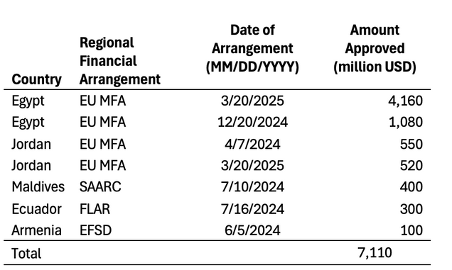 Jordan also secured MFA support, with cumulative commitments exceeding $1 billion. Additionally, the Maldives accessed $400 million from the South Asian Association for Regional Cooperation (SAARC), Ecuador borrowed $300 million from the Latin American Reserve Fund (FLAR) and Armenia received $100 million from the Eurasian Fund for Stabilization and Development (EFSD).