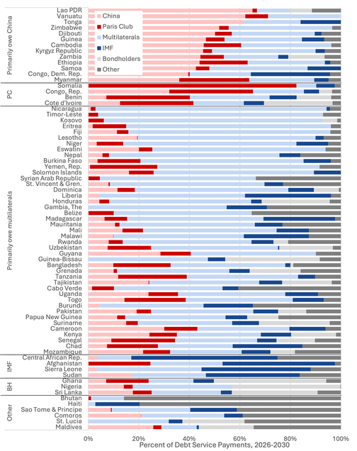 A similar distribution appears in Figure 10, which looks at debt service payments scheduled for 2026-2030. Again, most IDA countries (43 of 73) expect a plurality of their debt service payments to go to multilateral creditors over the next five years, followed at a great distance by China (13 countries), Paris Club creditors and the IMF (four countries each), and bondholders (three countries), with the remaining six countries expecting to predominantly repay other creditors.