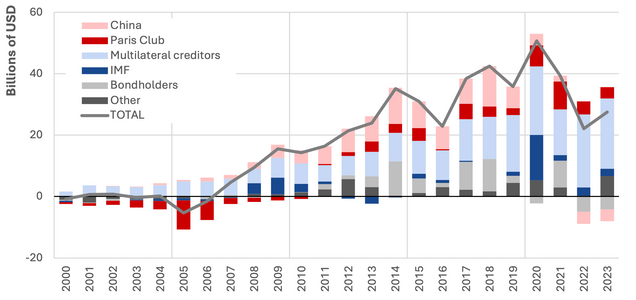 As Figure 1 shows, after 2020, LMICs have seen a sharp decline in net transfers––the difference between new disbursements coming in and the money going out to repay existing debts, including principal and interest payments. For low-income countries (LICs) in particular, net transfers have remained positive with two exceptions: Public and Publicly Guaranteed (PPG) debt net transfers from China and from bondholders.