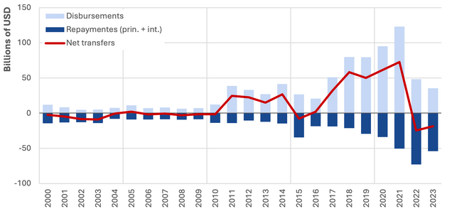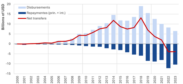 Figure 4: Disbursements, Interest and Principal Repayments and Resulting Net Transfers on PPG Lending from China to IDA-Eligible Countries, in Billions of USD, 2000-2023