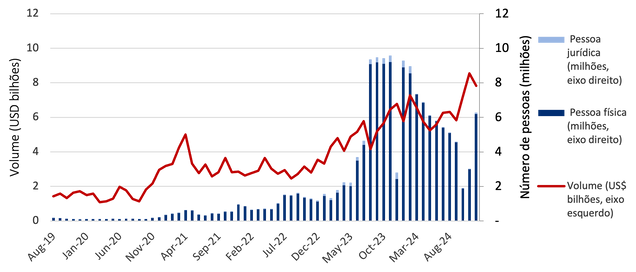 Figura 4: Saldo de Criptoativos por Pessoas Jurídicas e Físicas Brasileiras (milhões) e Volume (mensal), USD bilhões, agosto de 2019 – dezembro de 2024