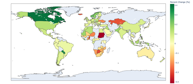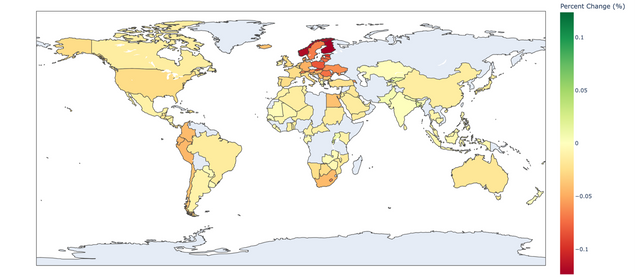 Lastly, the Combined Scenario (Figure 3) indicates that climate change tends to increase economic activity slightly in developed countries while climate change tends to reduce economic activity in developing nations. For instance, Canada, Norway and Qatar show mild gains, whereas Sudan, Kazakhstan and Ukraine experience losses.