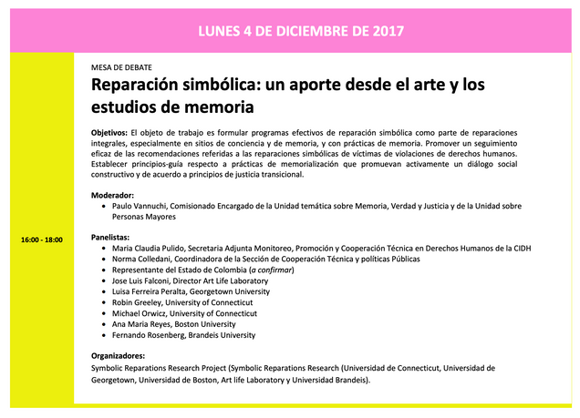 Professor Ana María Reyes will participate in the Inter-American System of Human Rights Forum: Reparación simbólica: un aporte desde el arte y los estudios de memoria, 5 December 2017, OAS headquarters Washington DC. More details and information can be found on the foroCIDH website.