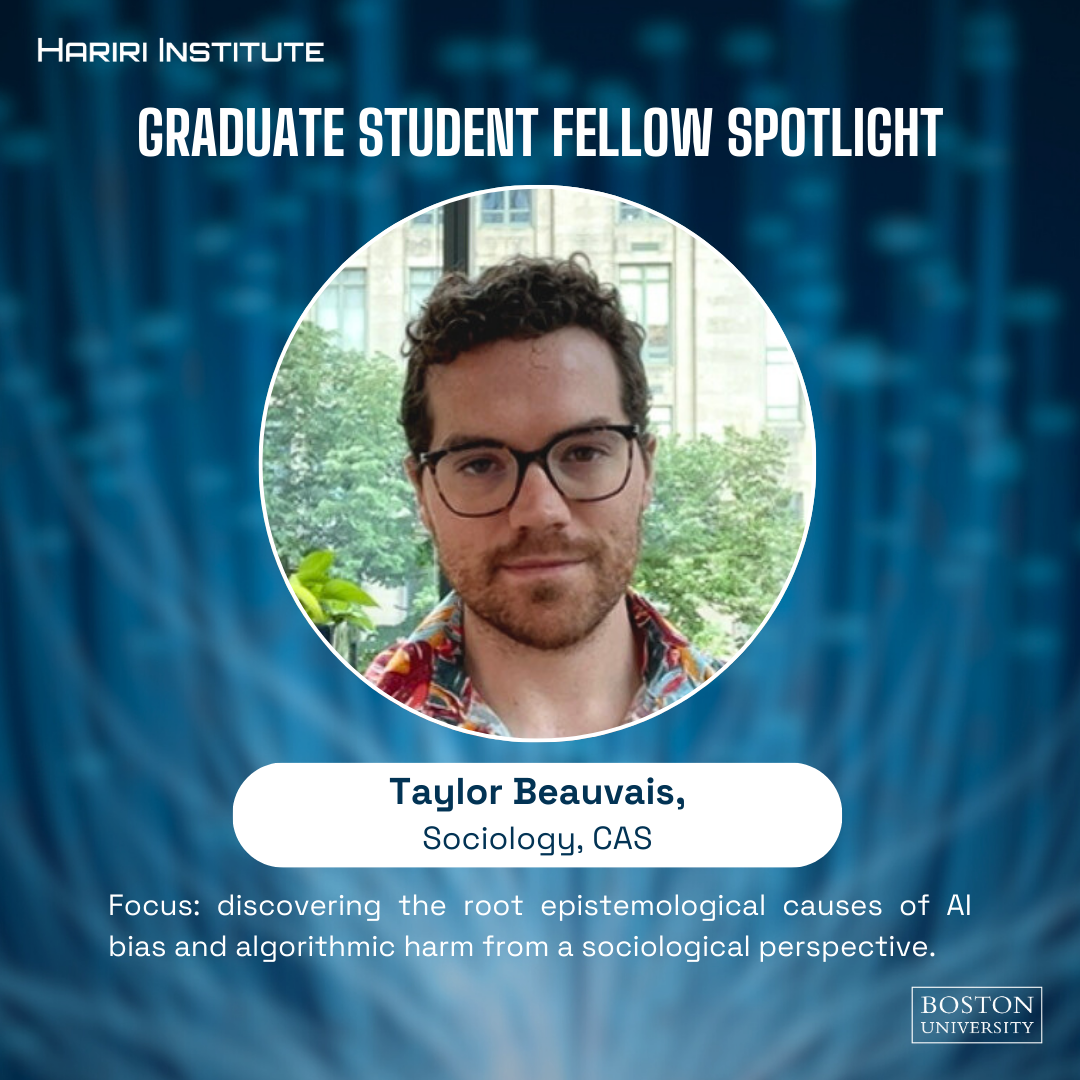 Taylor Beauvais is a third-year PhD candidate in Computational Humanities, Arts & Social Sciences studying Sociology and a 2024 Hariri Institute Graduate Student Fellow. His research area is on the impact of artificial intelligence in economics, social, and governmental systems. Beauvais is advised by Joan Donovan (COM), Jonathan Mijs (Sociology), and Neha Gondal (Sociology). He has a masters degree in public opinion, research methods, and data analytics from the University of Lausanne and a bachelor’s degree in psychology and sociology from the University of Buffalo.