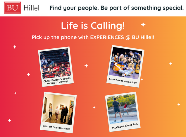 Hey Terriers, Based on what you have told us, you want more life experiences. We built Experiences as your ticket to skill-building, adventure, and unforgettable moments. This is Jewish life through doing. No lectures. No pressure. Just real opportunities to meet new people, try new things, and create memories that last.