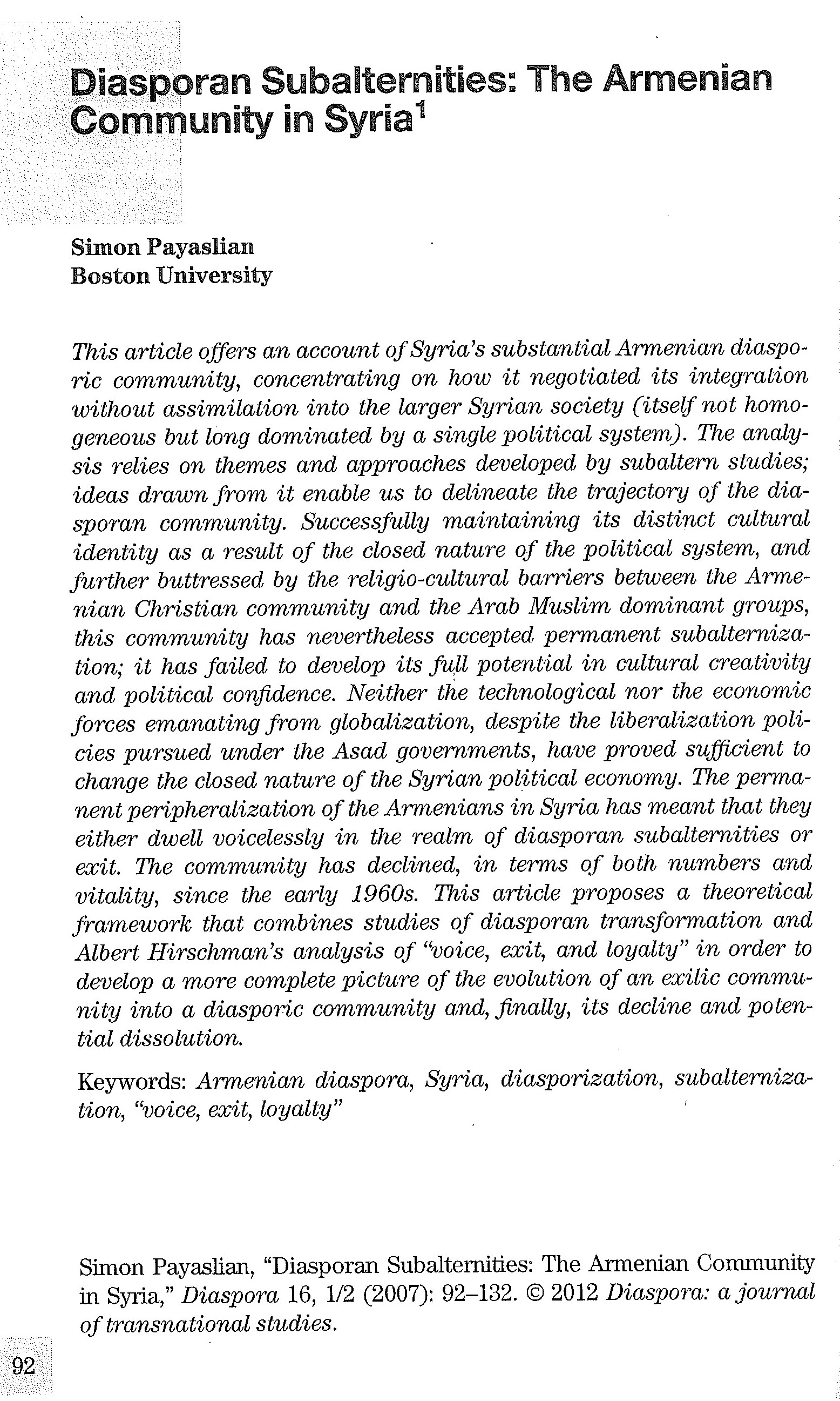 Professor Simon Payaslian, Kenosian Chair in Modern Armenian History and Literature, has published an article in Diaspora: A Journal of Transnational Studies 16:1/2 (2007 [2012]), the leading journal in diaspora studies. The article, entitled “Diasporan Subalternities: The Armenian Community in Syria,” examines the evolution and decline of the Armenian community in that country. The analysis combines theories in diasporan and subaltern studies as well as Albert Hirschman’s model of “voice, exit, and loyalty.” Payaslian argues that the once vibrant Armenian community in Syria began to decline beginning in the late 1950s and early 1960s for a number of reasons (eg, chronic political instability, religious differences, and the rise of Nasserism), and the current crisis under the Asad regime will further weaken the community, as Armenians in increasing numbers leave the country.
