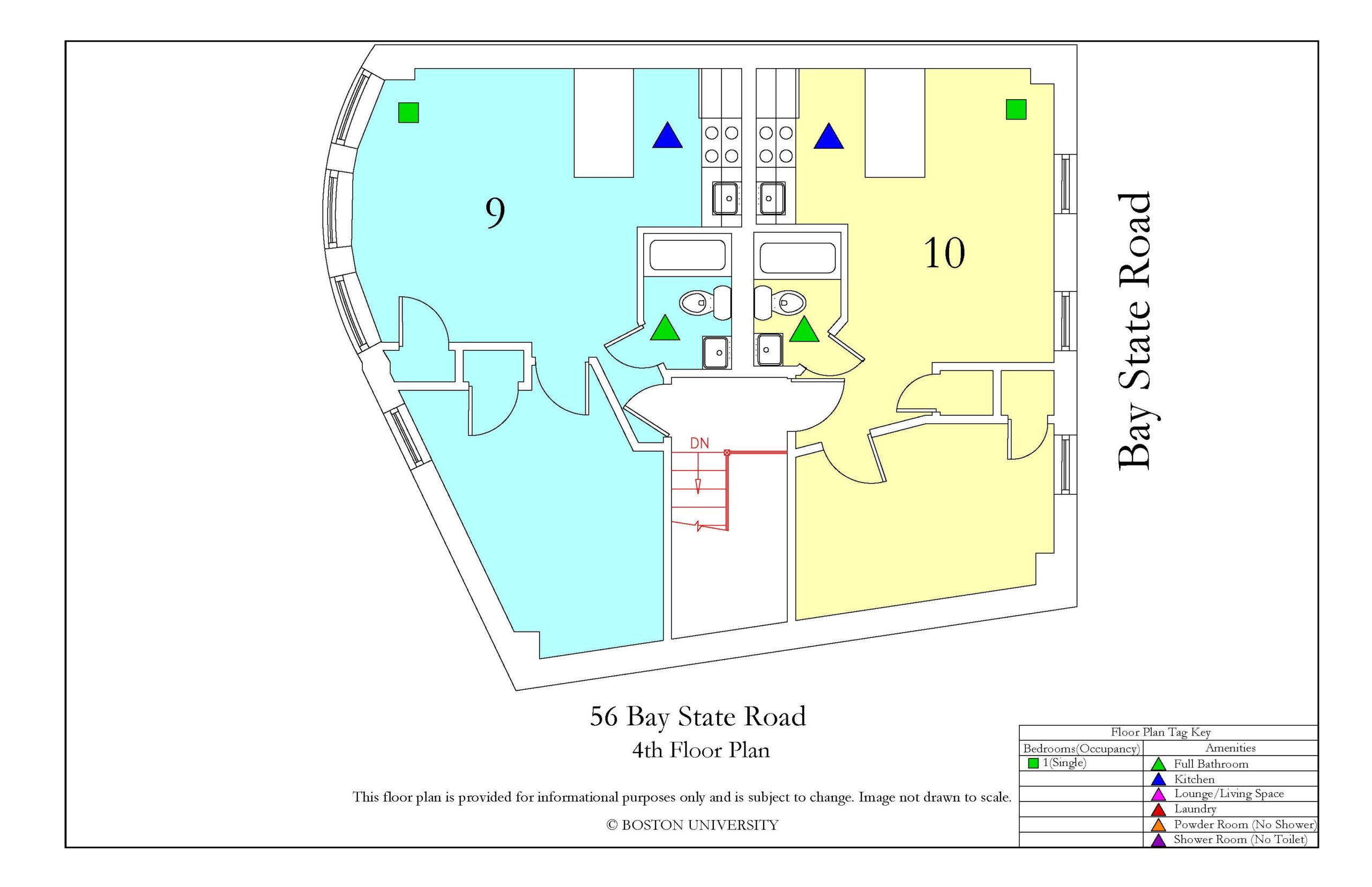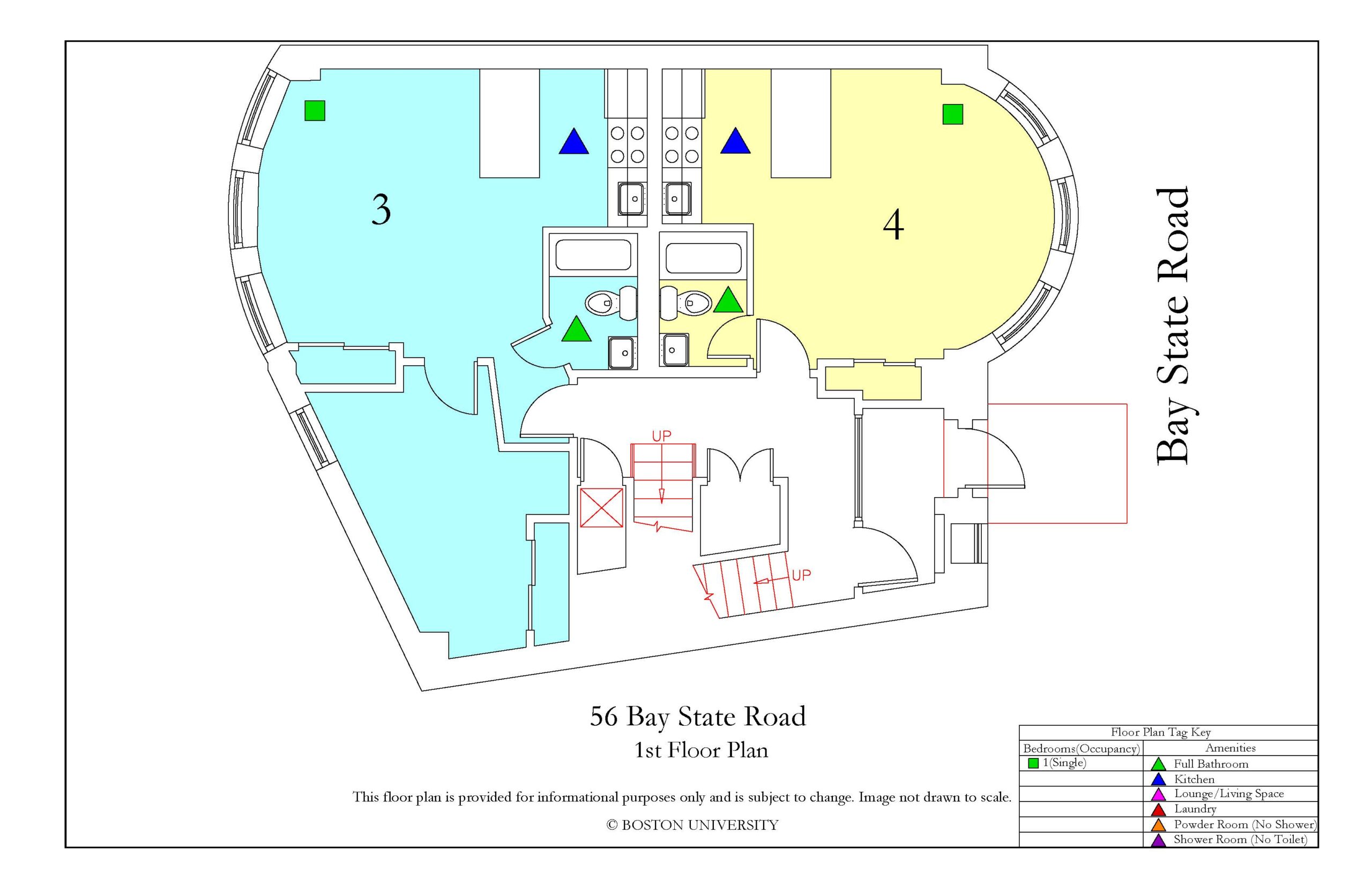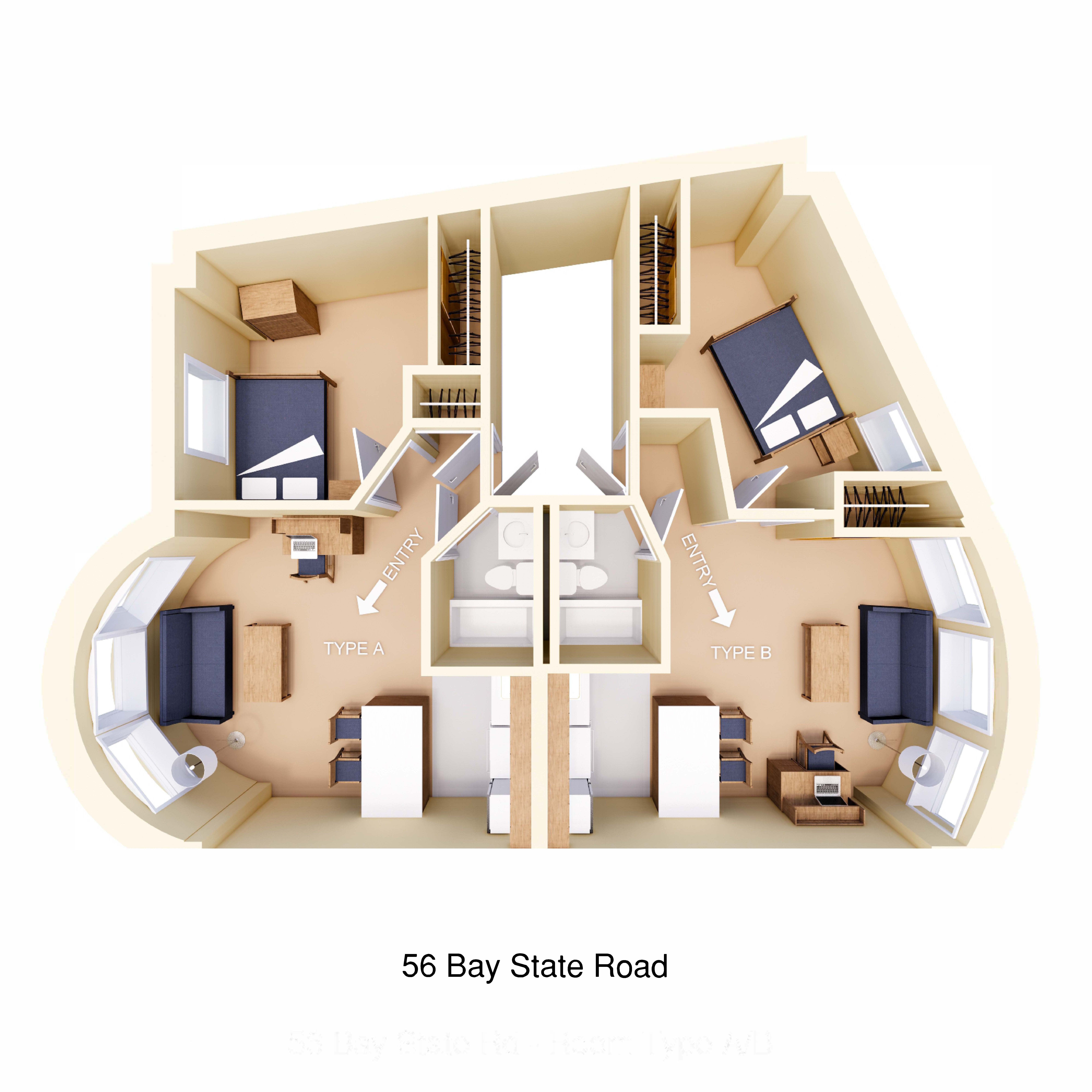 The building sits on leafy Bay State Road in BU’s East Campus. At one end, East Campus puts you right at the heart of BU’s Charles River Campus classrooms, labs, libraries, performances, and student amenities. At the other, you’re on the edge of Kenmore Square, a public transportation hub and the gateway to Fenway Park and its surrounding nightlife. Just beyond Kenmore lies Back Bay, with a bevy of upscale dining and shopping options.