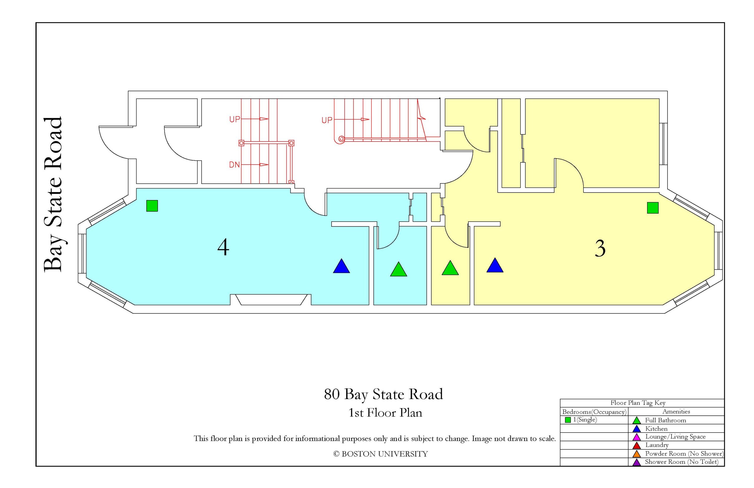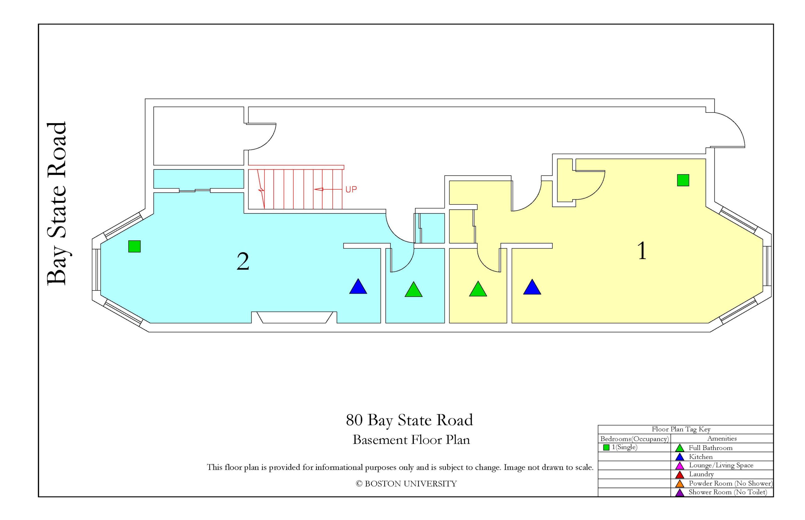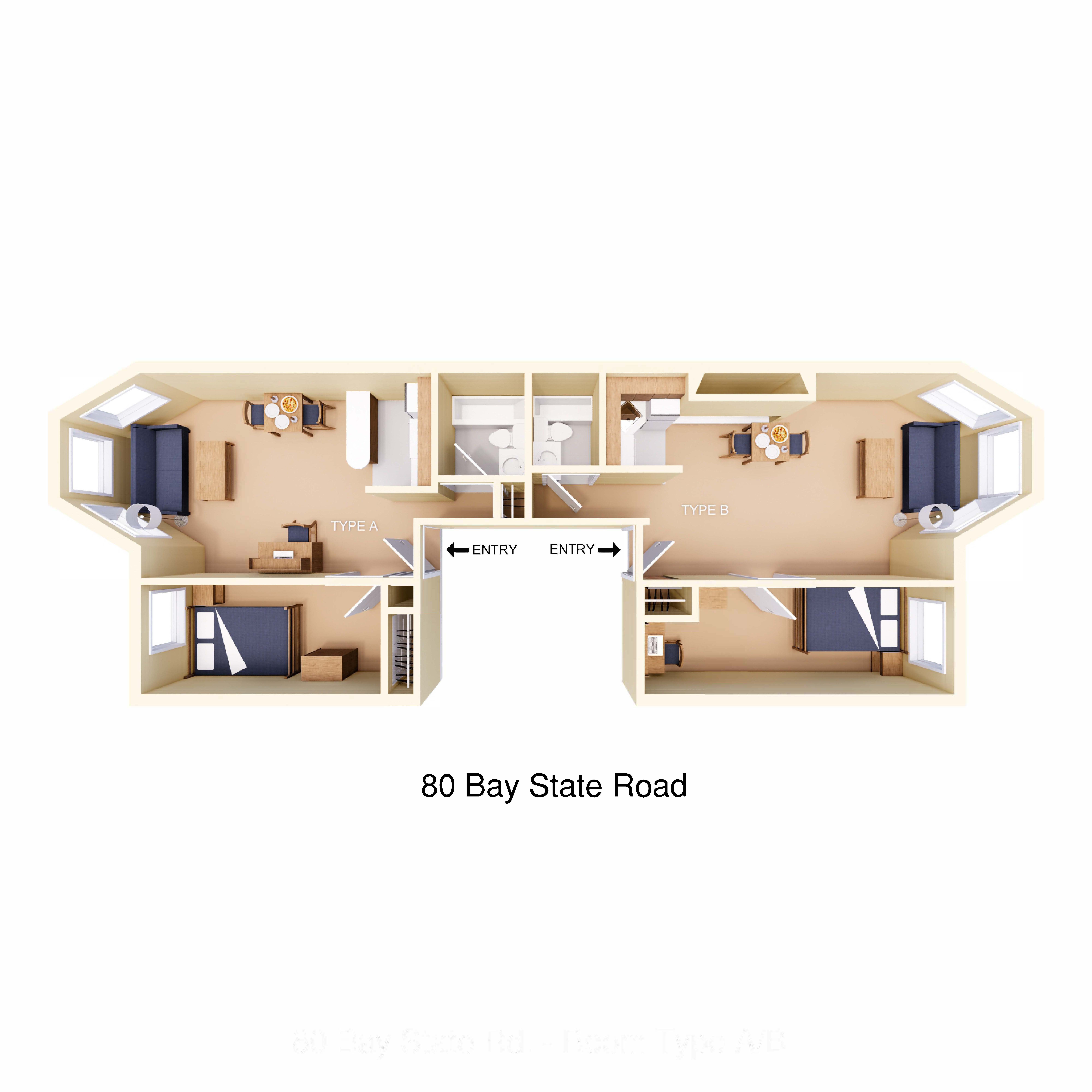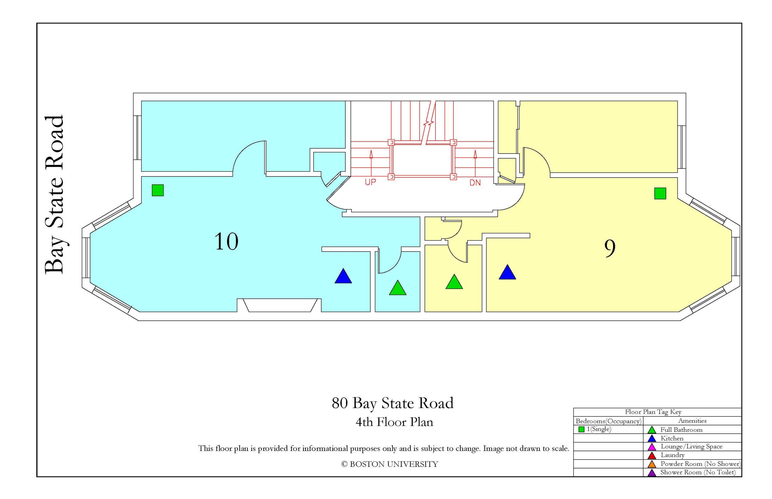 The building sits in BU’s leafy East Campus. At one end, East Campus puts you right at the heart of BU’s Charles River Campus classrooms, labs, libraries, performances, and student amenities. At the other, you’re on the edge of Kenmore Square, a public transportation hub and the gateway to Fenway Park and its surrounding nightlife. Just beyond Kenmore lies Back Bay, with a bevy of upscale dining and shopping options.