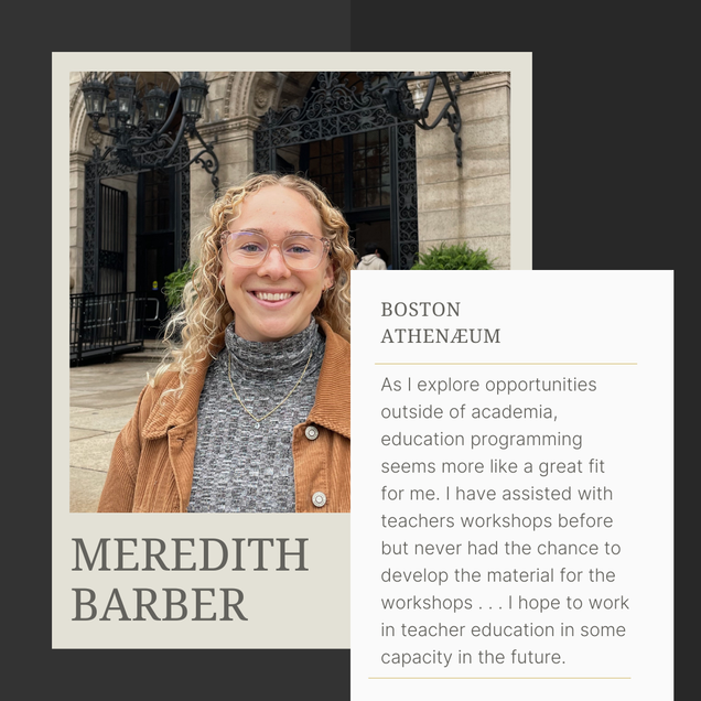 “I enjoyed using my research skills to create something that is useful to a broad audience.” Renée helped to research, organize, and plan the Boston Athenæum’s annual educator workshop, which is designed to help K-12 educators learn best practices for incorporating primary sources in their classroom teaching. See Renée talk more about her summer here.
