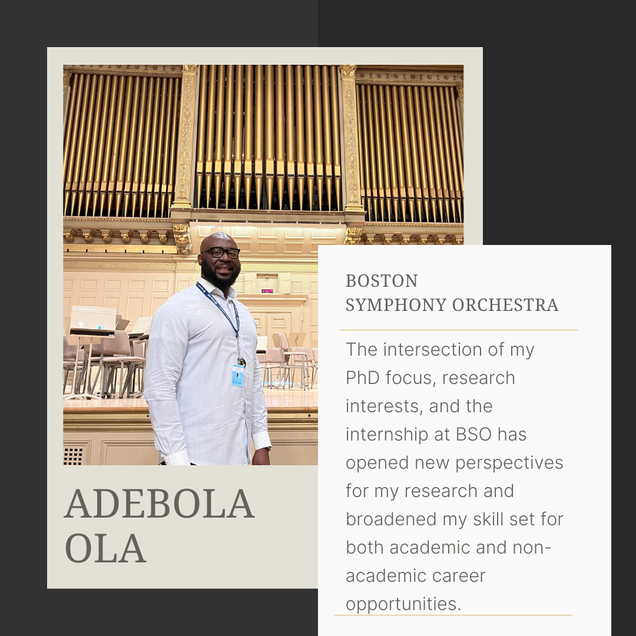 At the Boston Symphony Orchestra, Adebola Ola (Musicology & Ethnomusicology) digitized and documented current exhibition panels on display at Symphony Hall and created an Excel spreadsheet with over one thousand entries, documenting past panel exhibits from 2014 to 2024. Read Adebola’s full reflection.
