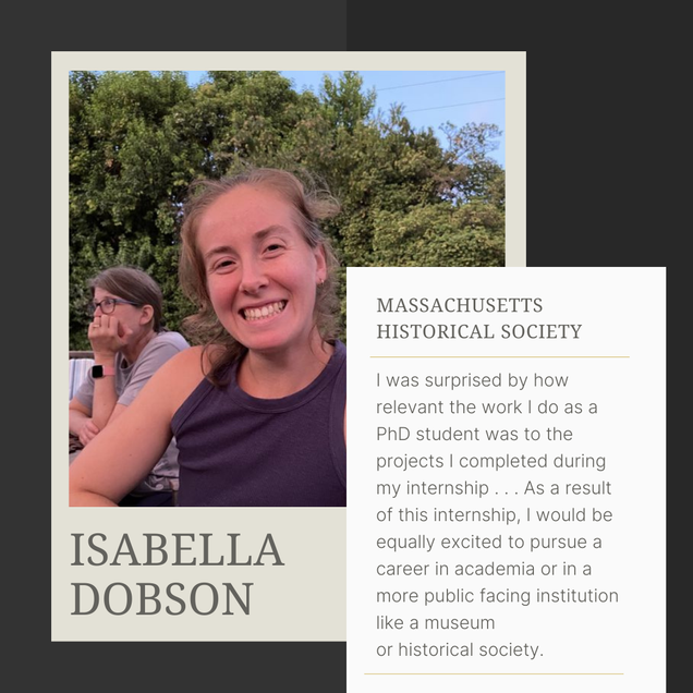 Isabella Dobson (History of Art & Architecture), whose research focuses on Renaissance and Baroque art, worked on several projects over the course of her internship at the Massachusetts Historical Society. The largest project required her to read and analyze primary sources related to Japanese American incarceration during World War II. Read Isabella’s full reflection.