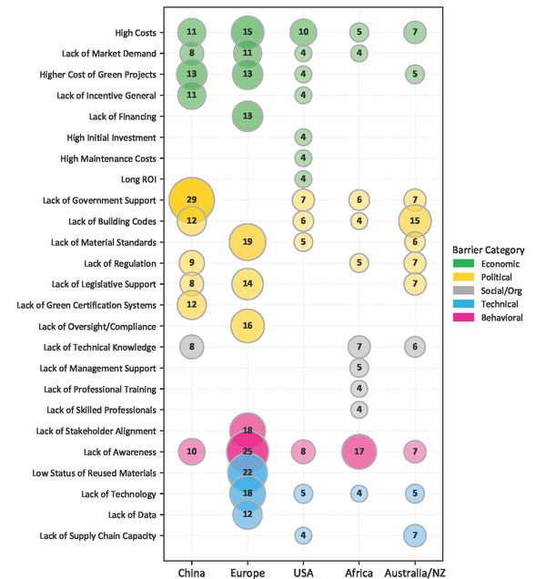 Globally, high costs are a prevalent concern for initial investments, particularly for green projects, along with a general lack of awareness about the benefits and risks of available technologies. Other often-cited barriers include limited government support, inadequate building codes, and poor market demand.