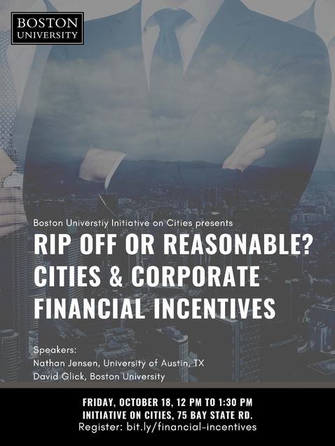 On Friday, October 18th, the Initiative on Cities held a discussion on corporate financial incentives in cities and how they may adversely affect economic development. University of Texas at Austin Professor Nathan Jensen and Boston University Political Science Associate Professor and Director of Undergraduate Studies David Glick led the presentation, exploring how cities use tax rebates, subsidies, and other financial incentives to attract corporate investment, and, more importantly, how these relationships help or hinder economic development.
