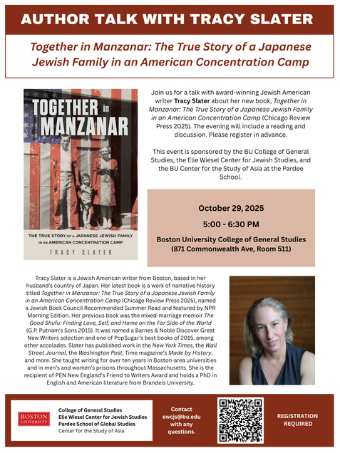 Join us for a talk with award-winning Jewish American writer Tracy Slater about her new book, Together in Manzanar: The True Story of a Japanese Jewish Family in an American Concentration Camp (Chicago Review Press 2025). The evening will include a reading, discussion, and book signing. Copies of the book will be available for purchase. Please register in advance