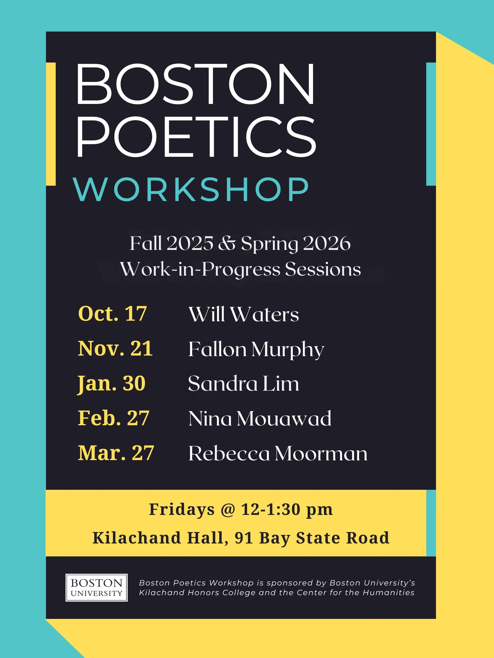 BPW was founded by Kilachand Honors College postdocs Talia Shalev and Sravanthi Kollu (now at the University of Washington), and is supported by funding from Kilachand Honors College, BU Center for Humanities, and BU English. To learn more about the workshop or to subscribe to BPW’s newsletter, send an email to bostonpoetics@gmail.com.