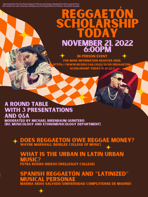 Join us for a roundtable discussion, moderated by Michael Birenbaum Quintero, featuring three short presentations of 10-15 min each by Wayne Marshall (Berklee College of Music), Petra Rivera-Rideau (Wellesley College) and Marina Arias Salvado (Universidad Complutense de Madrid). Sponsored by the BU Musicology & Ethnomusicology Department with support form the Center for Latin American Studies as well as the Department of African American Studies.