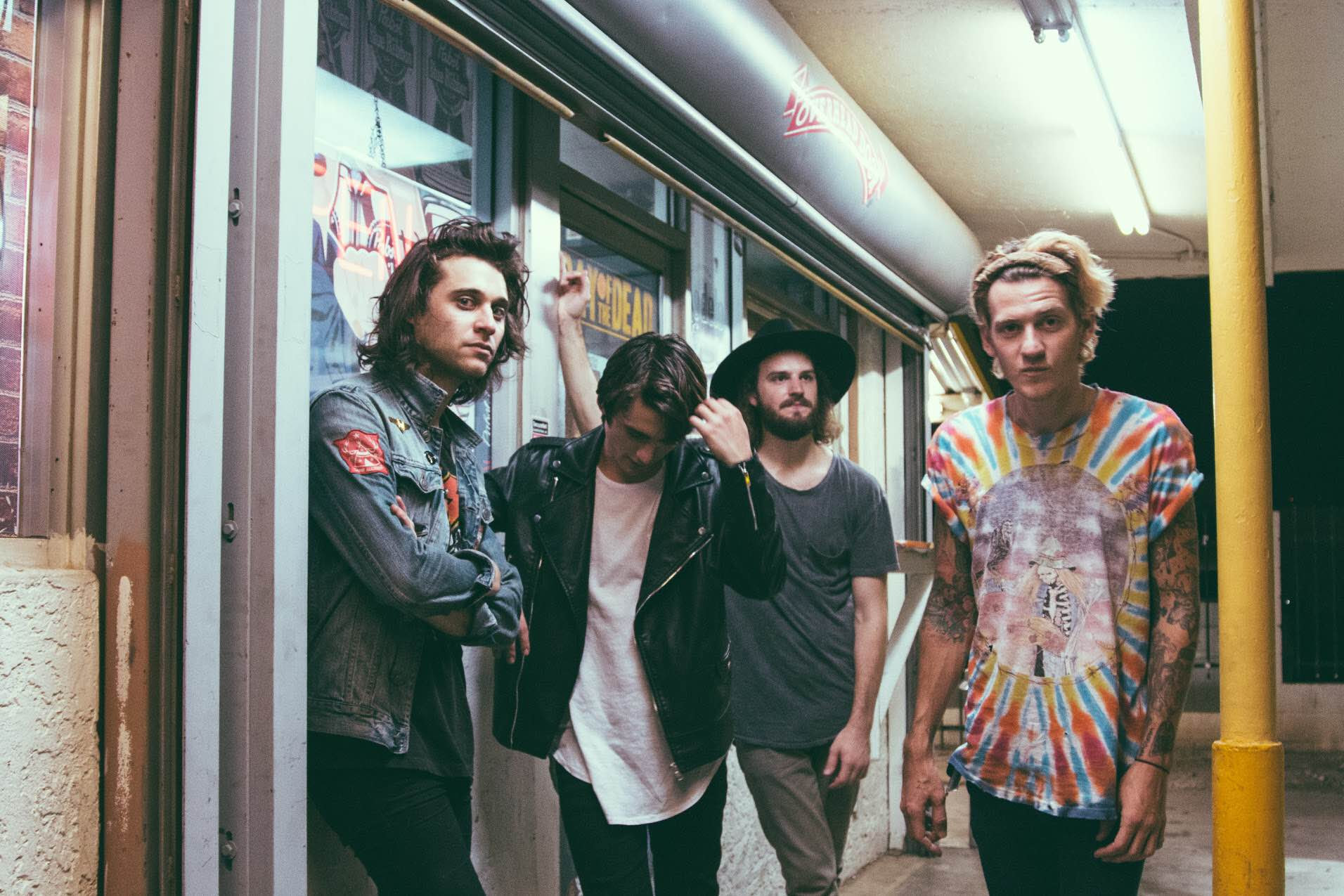 The band Beach Weather has players, Nick Santino, lead vocals and guitar, Reeve Powers, bass, Austin Scates, drums, and Ian Holubiak, lead guitar.