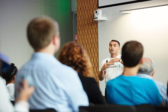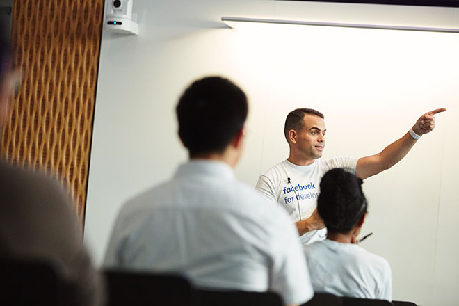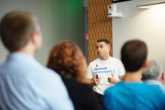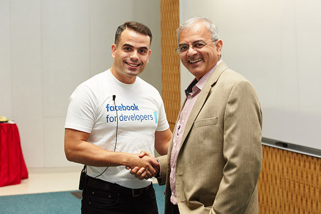 Metropolitan College takes pride in connecting motivated learners with developing opportunities in the professional realm. This was never better evidenced than when Boston University hosted the Boston launch of Developer Circles from Facebook, a community-driven initiative from the social media giant, which brought together regional coders and developers to learn, network, and knowledge-share. The free and open forum discussion was led by Nick Pinheiro (MET’09, MET’12), who earned his computer information systems master’s here at MET and is today a recognized authority on Facebook and Microsoft (Cloud) platform integration.