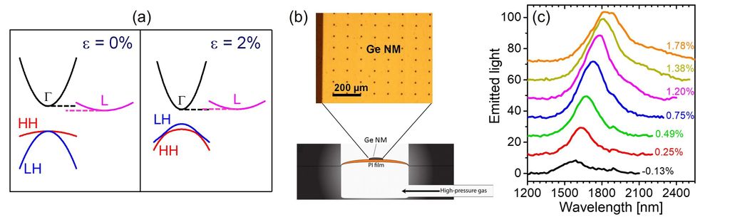 Optoelectronic devices based on silicon and germanium (the leading materials system of microelectronics) have been the subject of extensive research and development for the past few decades, motivated by their potential to enable the monolithic integration of photonic and electronic device functionalities on a CMOS-compatible platform. However, the development of Si/Ge active devices (particularly light emitters) is severely complicated by their indirect energy bandgap, which results in negligibly small radiative efficiency. To address this challenge, we have reported the first demonstration of direct-bandgap germanium capable of providing optical gain at infrared wavelengths. This work leveraged the unique mechanical properties of ultrathin nanomembranes to fulfill a long-standing theoretical prediction of the effect of strain on the Ge band structure. Correspondingly, it opened the way for a new line of research focused on CMOS-compatible group-IV active optoelectronics based on strain engineering.