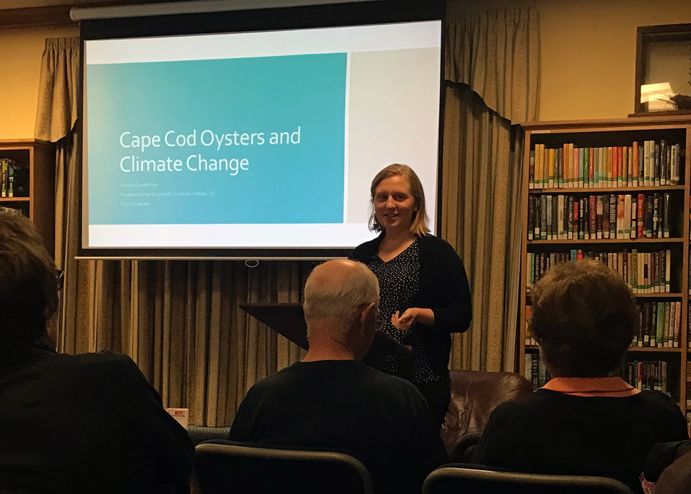 Ariana Gunderson, a graduate student in the Department of Gastronomy and a 2018 Graduate Summer Fellow at the Frederick S. Pardee Center for the Study of the Longer-Range Future, recently gave a presentation titled “Cape Cod Oysters and Climate Change” at the Cotuit Library on Cape Cod. The talk was based on the findings from her summer research project at the Pardee Center, where she studied how oyster farmers in the town of Barnstable (in which Cotuit is a village) understand and respond to threats posed by climate change.