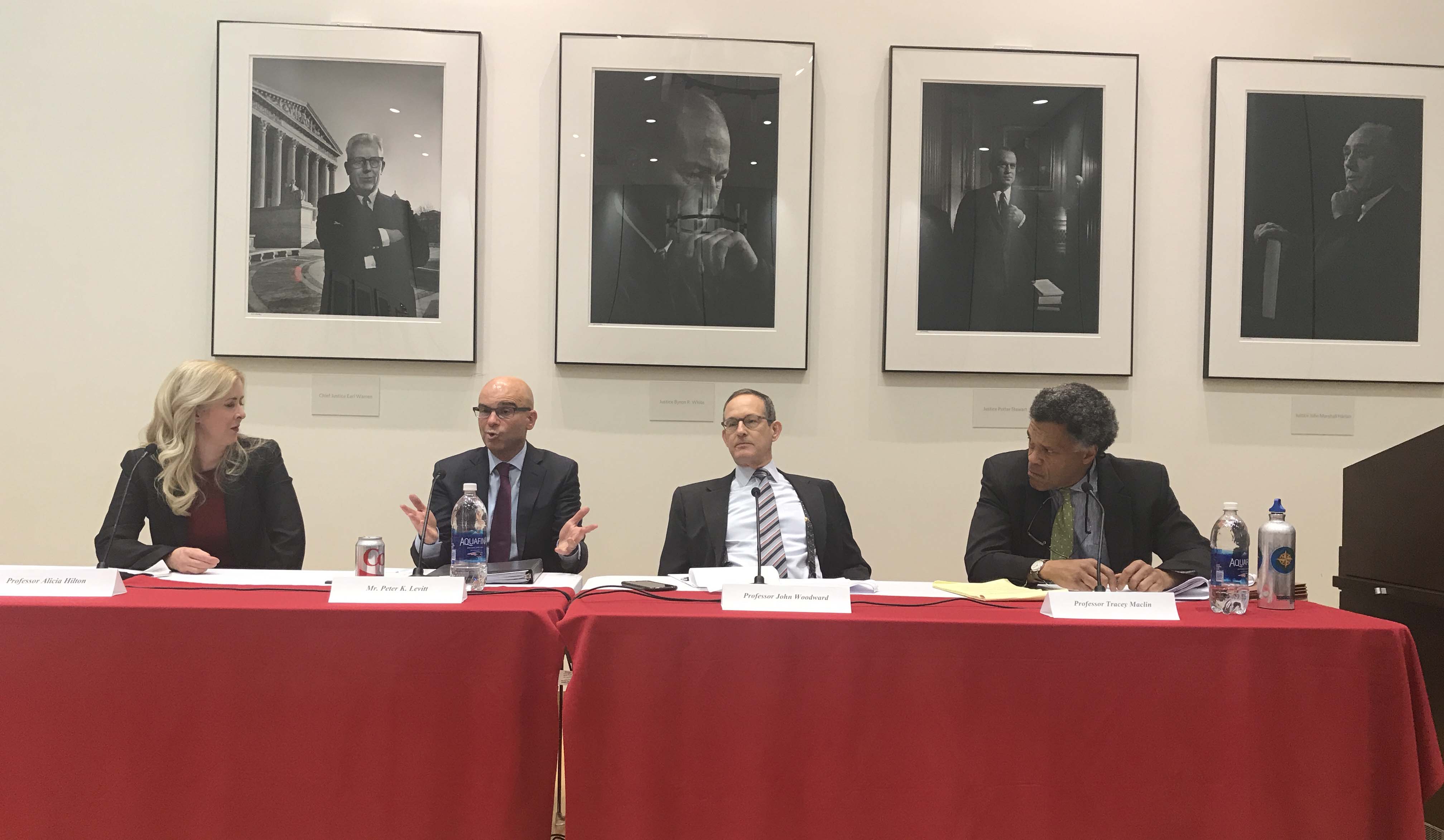 BU Law Professor Tracey Maclin moderated the debate. BU Law student Jessica Lujan introduced the speakers who along with Woodward included Alicia Hilton, a professor at the John Marshall Law School and Peter Levitt, Esq., a former Assistant U.S. Attorney for the District of Massachusetts. The BU Law School’s Federalist Society sponsored the event.