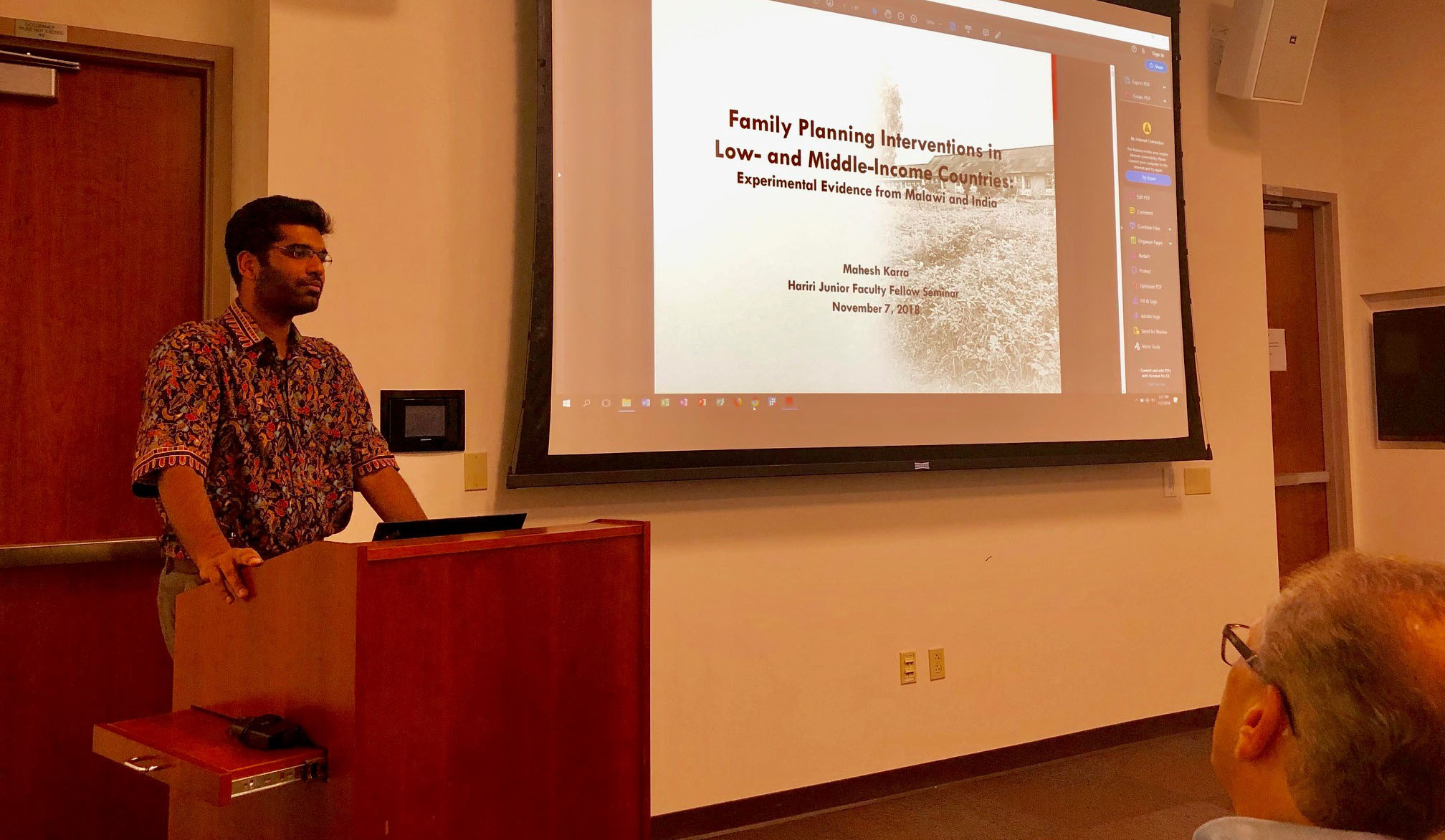 Karra delivered a talk entitled “Family Planning Interventions in Low- and Middle-Income Countries: Experimental Evidence from Malawi, India, and Sri Lanka,” which focused on preliminary evidence from three ongoing field experiments from Sri Lanka, India, and Malawi that, when taken together, seek to identify the causal impact of family planning interventions on first stage outcomes, including contraceptive use, family planning knowledge, and awareness.