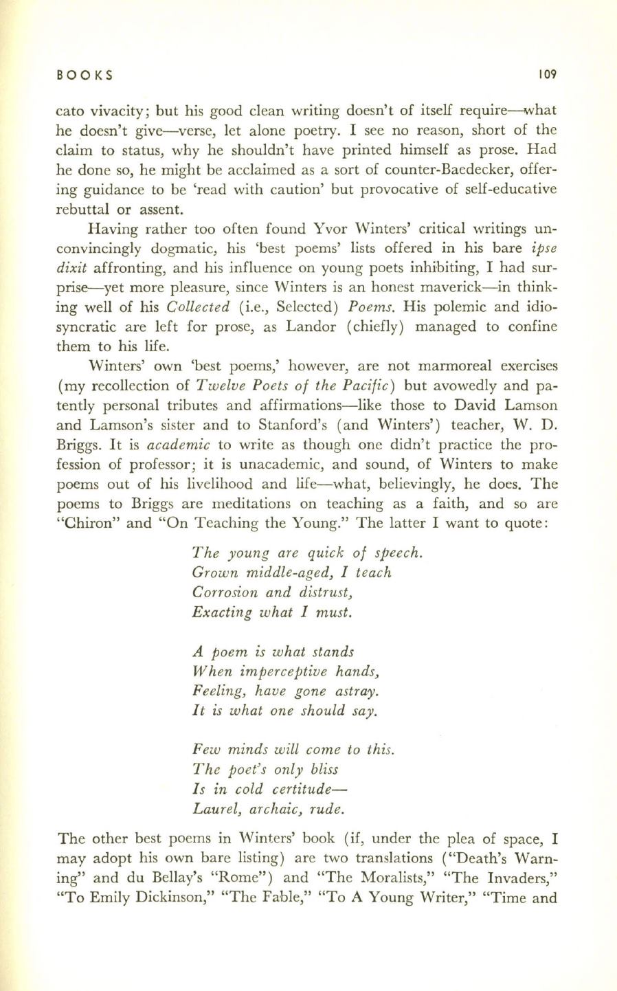 Winters' own 'best poems,' however, are not marmoreal exercises