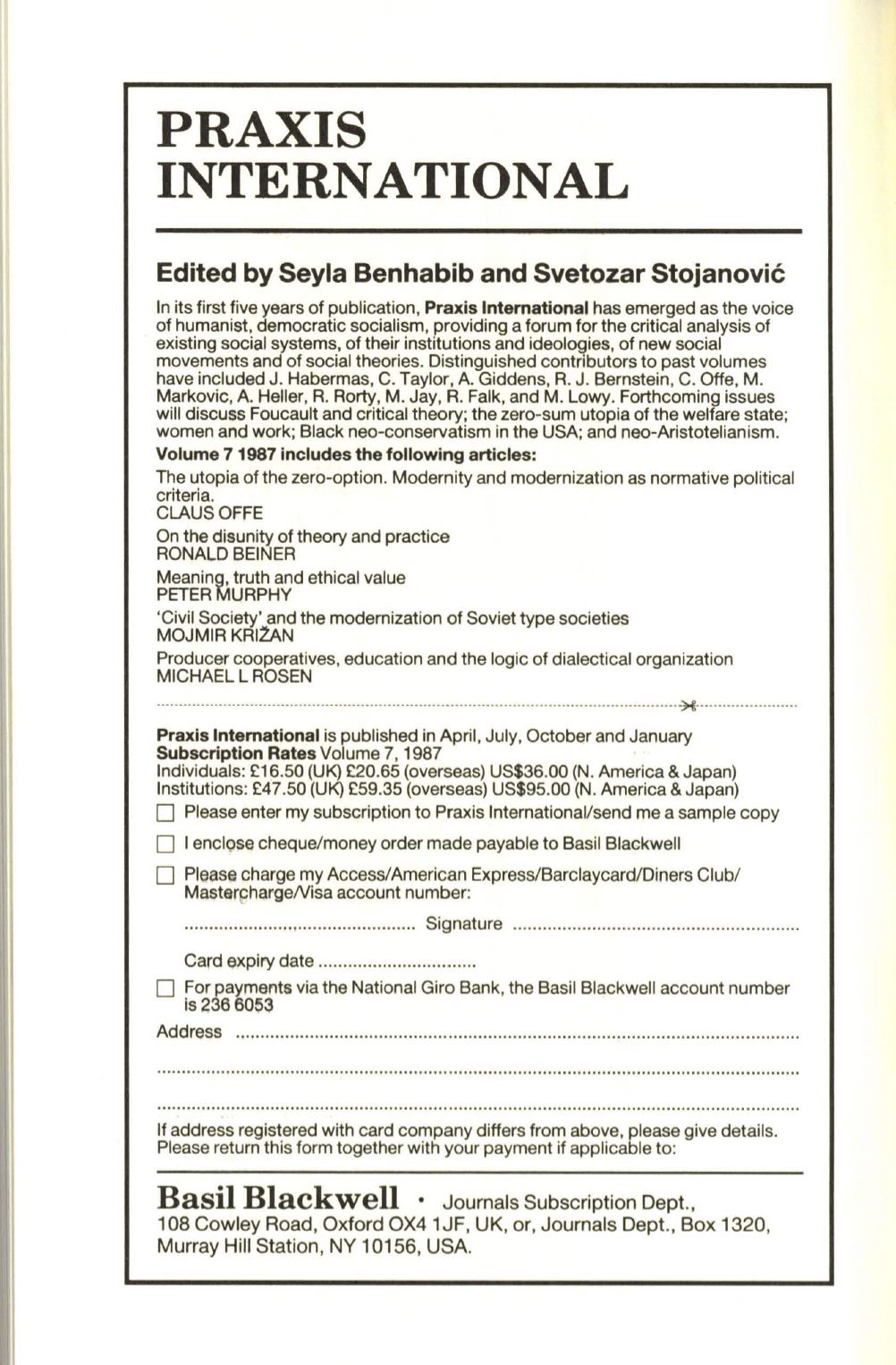 Heller, R. Rorty, M. Jay, R. Falk, and M. Lowy. Forthcoming issues