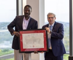 Anthropology Professor Fallou Ngom receives the 2024 Provost’s Scholar-Teacher of the Year Award from University Provost ad interim Kenneth Lutchen. (Photo by Mike Spencer)