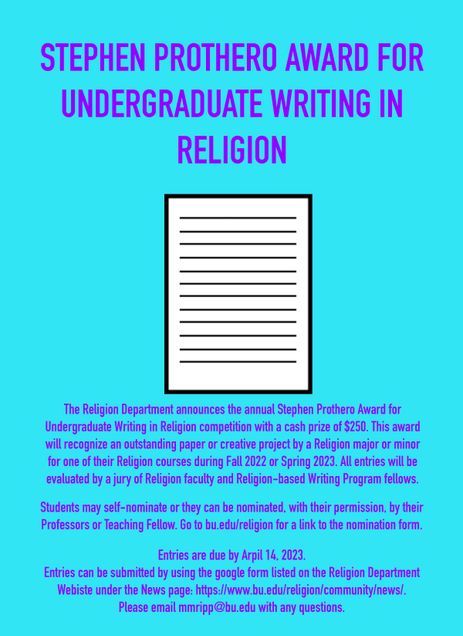 The Department of Religion announces the annual Stephen Prothero Award for Undergraduate Writing in Religion, with a cash prize of $250. This award will recognize an outstanding paper or creative project by a Religion major or minor for one of their Religion courses during Fall 2022 or Spring 2023. All entries will be evaluated by a jury of Religion faculty and Religion-based writing program fellows.