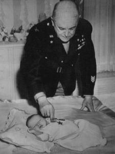 US Army Colonel Robert Collins pins two medals on six-week-old Ann Hamilton Landess, the daughter of Captain Robert Landess