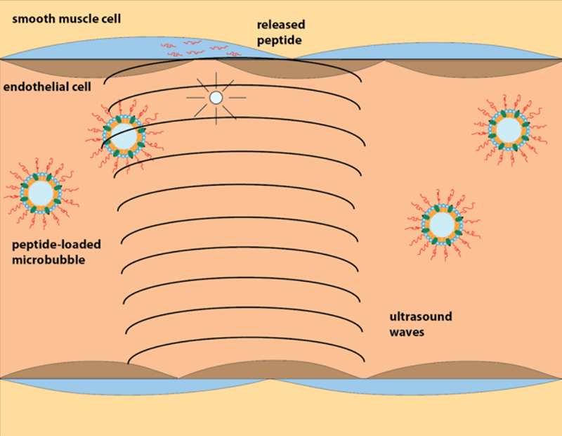 “The cells we need to target don’t come in contact with flowing blood. They’re behind a layer or two of other cells and connective tissue in the blood vessel walls,” says Porter. In order to break through those layers and deliver the drug to smooth muscle cells, he’s attaching Morgan’s peptides to the outside of each microbubble. Focused ultrasound can be used to push the microbubbles toward the aortic wall and pop them to release the peptide. The “popping” process also subtly and reversibly disrupts the lining of the aorta, making the blood vessel wall temporarily permeable. “Once that happens, the peptide can flow directly into the spaces that open up in the vessel wall, and go straight into the smooth muscle tissue,” Porter says.
