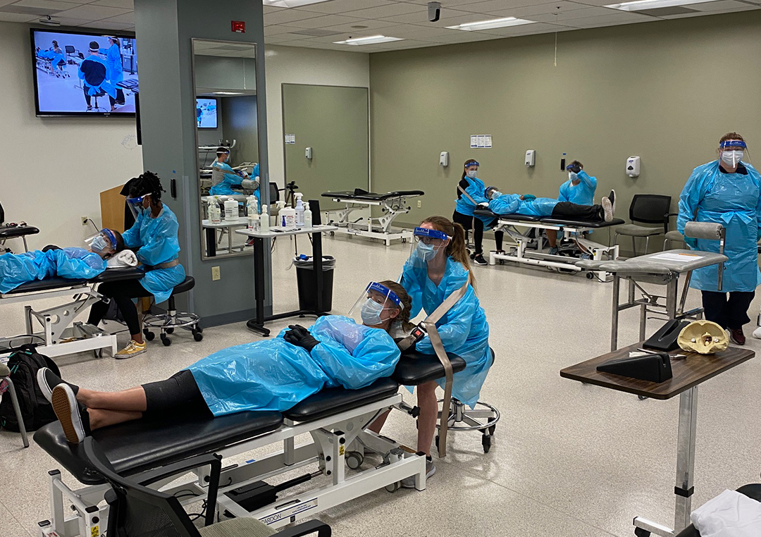 Physical therapy students in full PPE made up for lost in-person class time by learning and practicing skills at an intensive September boot camp. Photo by Hannah Gay