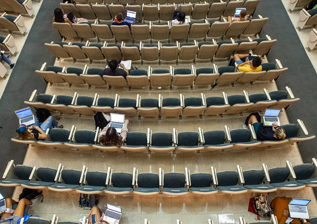 Students in Elizabeth Co’s human physiology class sat socially distanced after displaying badges on their phones attesting that they had recently tested negative for COVID. Photo by Cydney Scott