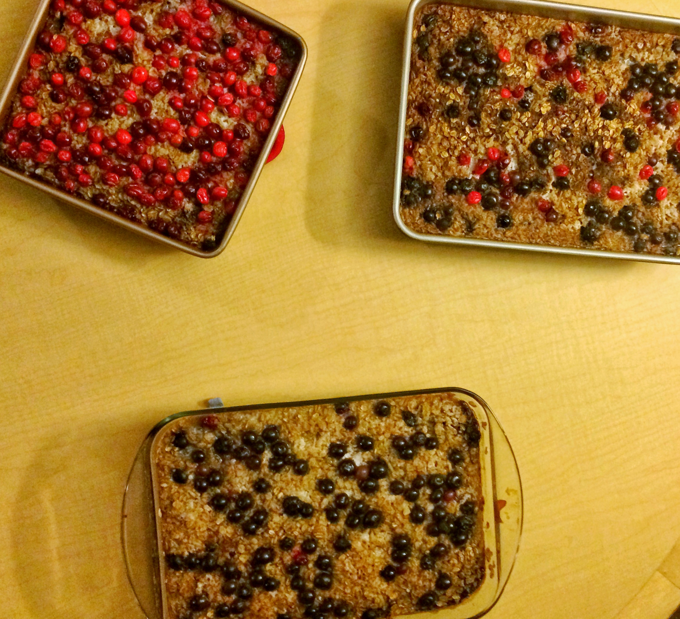 We made a delicious blueberry baked oatmeal recipe. The way the dish was layered and baked resembled an apple crisp or crumble, so it was very dessert-like. The recipe called for blueberries, but we added in cranberries too which turned out to be a pleasant, tart surprise. The baked oatmeal can be topped with your favorite spices after it comes out of the oven (cinnamon, nutmeg, etc.). I would also recommend adding some nuts or seeds for a little crunch after serving.