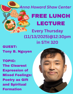 - Join us for our free Thursday Lunch Lectures each week held in STH 320 at 12:30pm. The theme for this semester’s series is “Collaborative Leadership: Challenges and Meaningfulness” or “Sharing Your Community Building Experience”. This week our guest speaker will be Tony B. Nguyen, and the talk title is “The Clearest Expression of Mixed Feelings: Poetry as Gift and Spiritual Formation”. Food is provided, join us in STH 320!