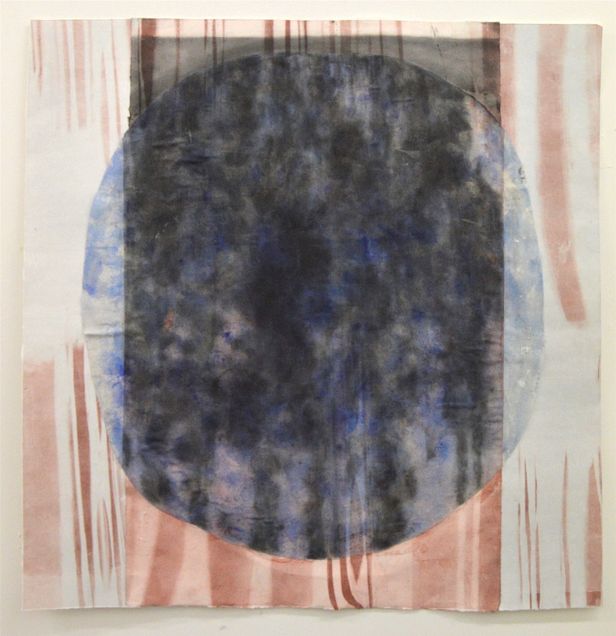 Aisling Wilson “Blue Moon” monotype, collage, fabric mesh, acrylic and graphite powder on paper 84.1cm x 118.9cm