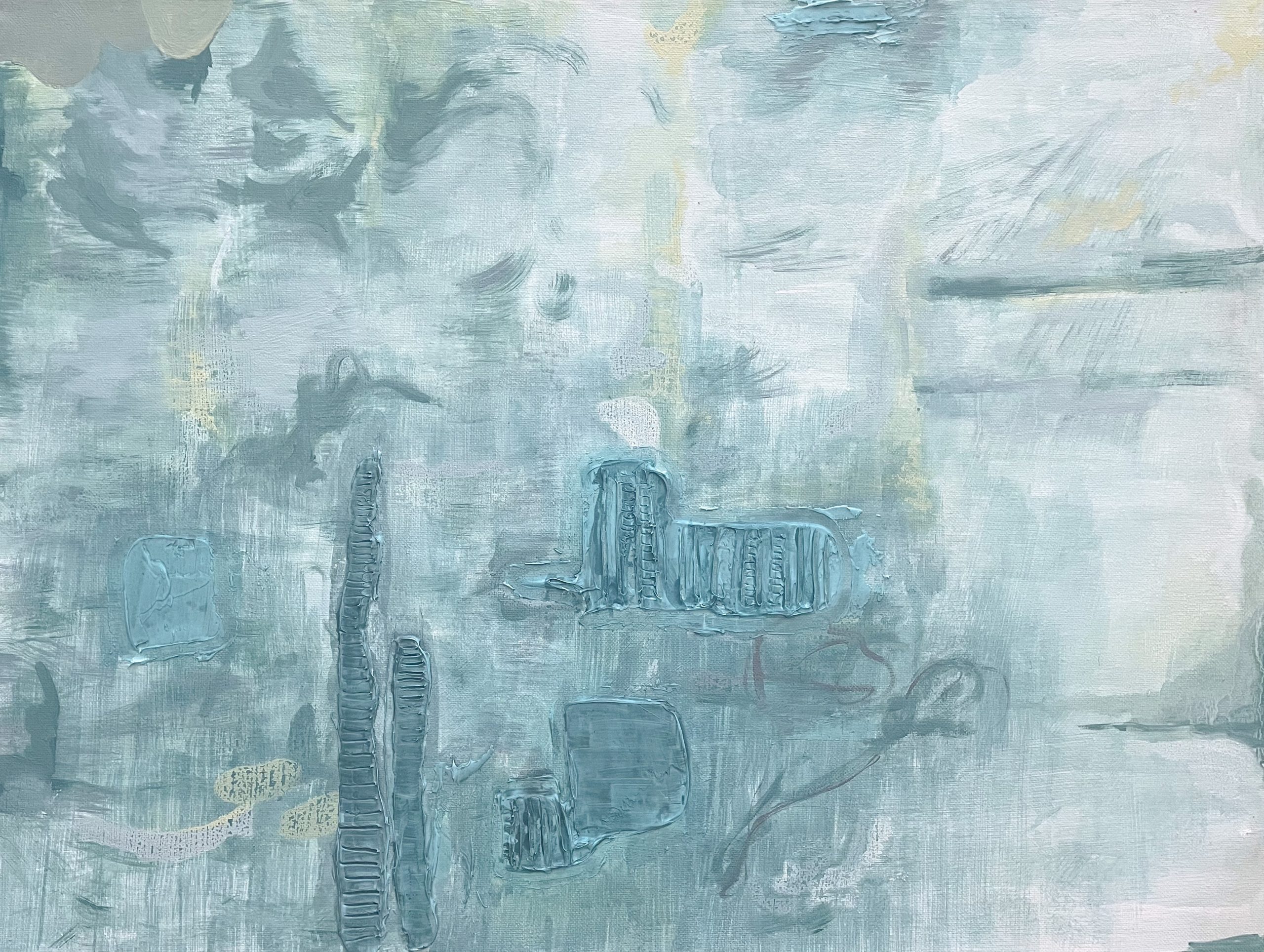 HERA-2-scaled Ran (Hera) He “Stress and the City” Acrylic, watercolor, modeling paste on canvas 18”x24”