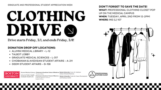 Help your fellow Terriers dress to impress by donating gently-used professional attire to the Professional Clothing Closet! The clothing drive, sponsored by Alumni Medical Library and the Student Services departments across BUMC, are accepting donations from March 1-8. Save the date (Tuesday, April 2) for the PCC Pop Up on the Medical Campus and shop sustainably!