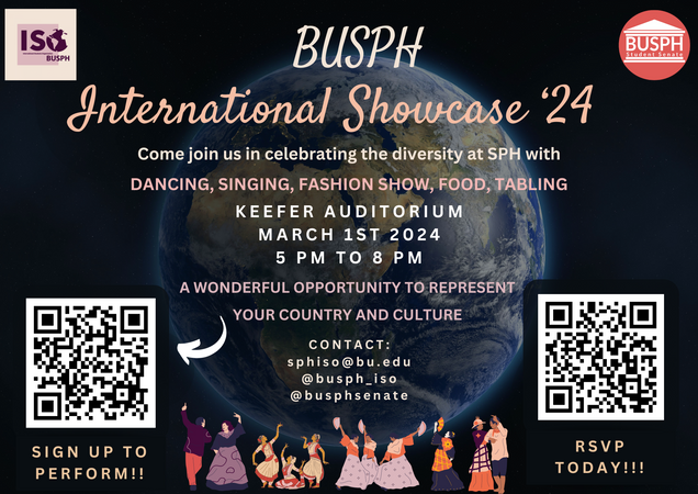 The BUSPH International Showcase’24 is on 1st March 2024 from 5 to 8 PM EST in Keefer Auditorium. We wish to use the occasion to celebrate the diverse cultures at BUSPH. All on-campus students, faculty, and staff are welcome! Sign up to participate here and RSVP to attend. Sponsored by Graduate Student Life and in collaboration with Student Senate.