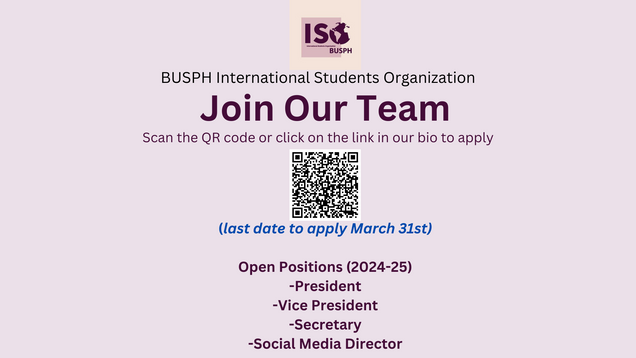 Apply here to be part of the International Students Organization’s Executive Board! Last date to apply is March 31st.