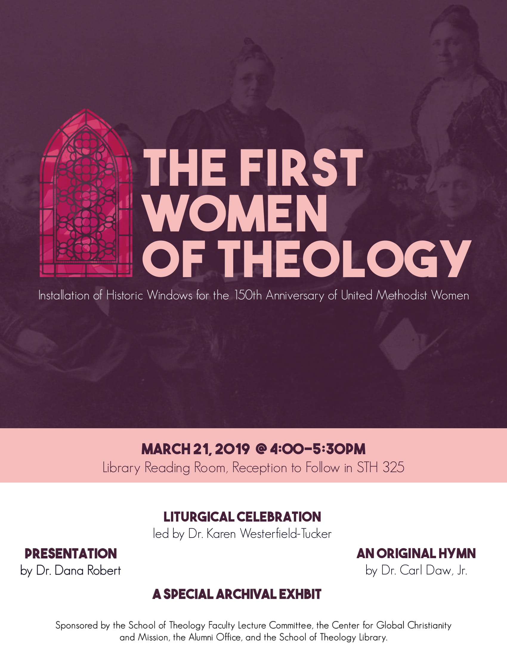 This online exhibition is paired with an in-library exhibition during the Spring 2019 semester, with special lecture by Dr. Dana Robert titled “The First Women of Theology: Installation of Historic Windows for the 150th Anniversary of United Methodist Women” on 21 March 2019. This exhibition intends to highlight the honored in the windows installed in the School of Theology Library, originally installed in the Tremont Street Methodist Episcopal Church. We celebrate the 150th Anniversary of the Woman’s Foreign Missionary Society (predecessor of the United Methodist Women), an organization which supported the work of women in foreign lands founded during a stormy night on 23 March 1869.