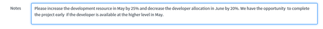 If you want to make a “small” change to your resource plan, such as changing one or two months up or down simply add a note to the resource plan requesting that the Resource Manager adjust the plan. This will send an email notification to the RM with the content of your note.
