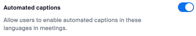 - Automated caption languages: Available languages can be added or removed as needed. This affects the list of languages presented when starting captions in a meeting.
