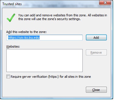 2) Type in https://ist-bz.bu.edu and click on the Add button. Click Close.