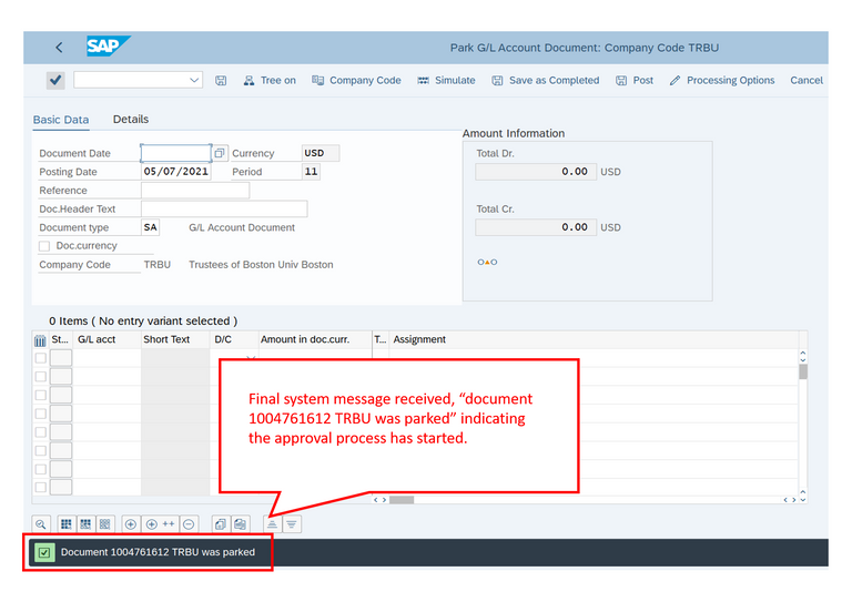 | Step.5 | Complete the required information on the line item area. G/L acct, Debit/Credit, Amount, Text and Cost Object (Cost Center, Internal Order or WBS Element). |