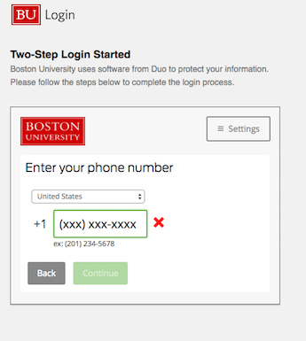 The first time you attempt to log in to any Boston University service that requires two-factor authentication you will be redirected to a set-up page like this: